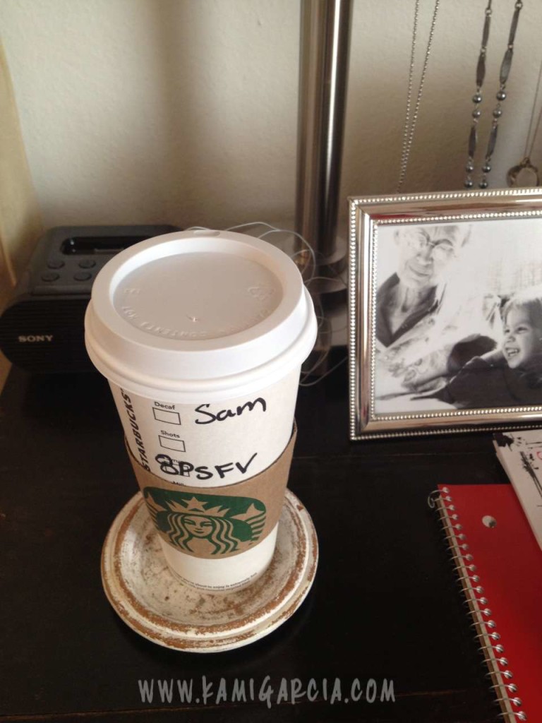 9:40 AM – I’m back in my bed (otherwise known as my home office where I spend my time when I’m not at my real office). Yvette comes over with Starbucks because she rocks (skinny vanilla lattes with 2 extra pumps of vanilla for both of us). You may notice that the cup says “Sam” instead of Yvette or Kami. If you have names like ours that are constantly misspelled and mispronounced at places like Starbucks, you probably have what I refer to as a “coffee name” too. I wanted mine to be Magneto, but Yvette would never go to Starbucks with me if I used that one, so I use Alex, my husband’s name instead.
