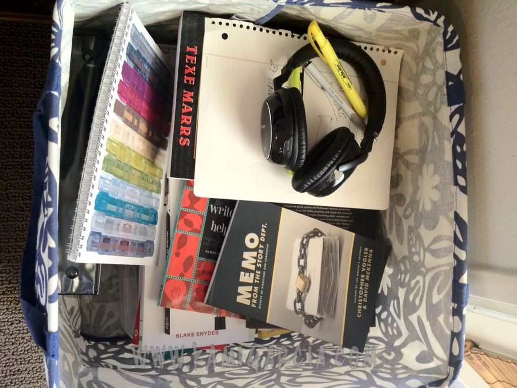 10:00 AM – I just bought this awesome bin to hold all the research and writing books I’m currently reading, as well as the binder with a hard copy of my revision & the spiral notebook I’m using for the sequel to UNBREAKABLE. Before I complete a “beat sheet,” or the 15 main beats / plot points in my novel, I brainstorm in a notebook. I use Blake Snyder’s Beat Sheet based on his novel SAVE THE CAT. You can download his beat sheet for free on his website, BlakeSnyder.com. You can also download more detailed versions of his beat sheets adapted for novelists at LizWritesBooks.com. Before I actually complete the beat sheet, I do TONS of brainstorming. I start with a list of “What If” questions along the lines of “What if Kennedy does_________?” I don’t end up answering all the questions, but they usually leading me to ideas I DO end up using. I also have a section in the notebook for research notes and concepts I want to include, which I will import into Scrivener before I start drafting.