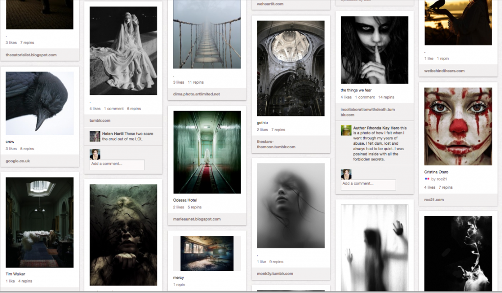 11:56 PM – I hang out on Twitter for a while, then I hit Pinterest, a free online site where you can collect images of things you love and save them in categorized albums called “pin boards.” I am a Pinterest addict. I have boards for everything from my favorite jewelry and looks, to a Beautiful Creatures movie board and inspiration boards for writing. The screenshot above is from my pin board for UNBREAKABLE.